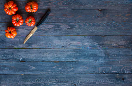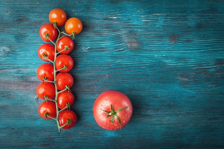 Tomatoes over blue wooden background with copy space