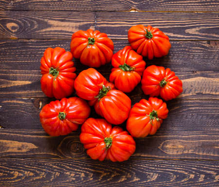 Close up fresh tomatoes on wood table.