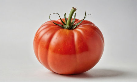 A single, ripe red tomato sits on a white surface