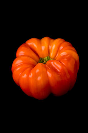 A closeup shot of red ripe flat tomato isolated on blackbackground