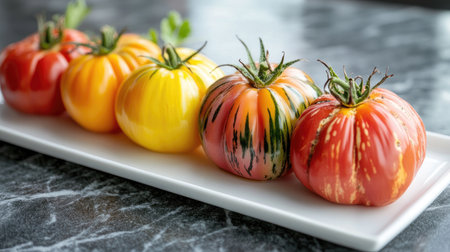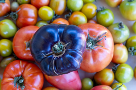 A vibrant assortment of fresh organic tomatoes showcasing various colors and shapes, perfect for culinary use or agricultural displays, symbolizing healthy living.
