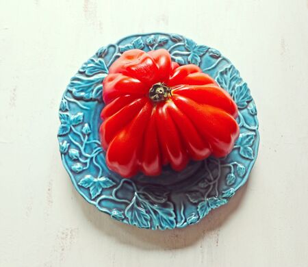 Beef heart tomato on a blue plate