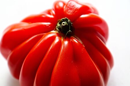 A large red tomato on a white background of unusual shape.