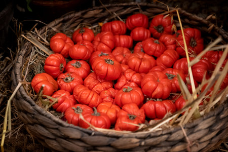 Ripe, bright red tomatoes on the vine, showing fresh water droplets. Sitting in a woven basket, suggesting healthy, organic food