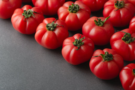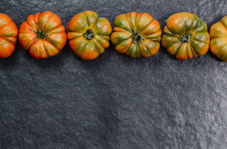 Tomatoes on black stone background with copy space. Fresh ripe organic tomatoes on dark table, top view