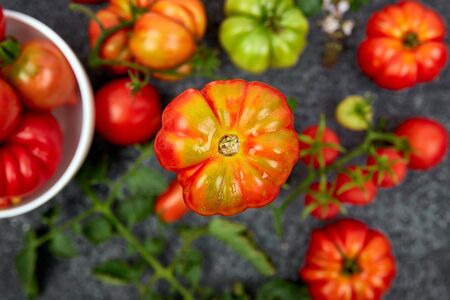 home tomatoes, different varieties from home garden - real photo from harvest