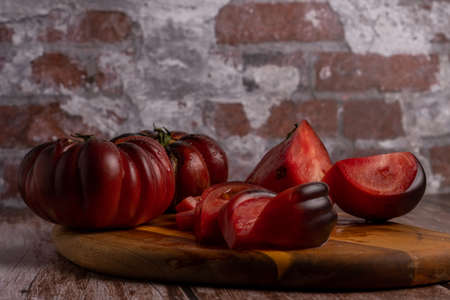 group of cut and whole organic Moorish tomatoes on a wooden board with a brick wall in the background