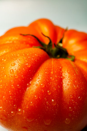 Close-up of a ripe red tomato glistening with fresh water droplets, showing its vibrant color and texture against a clean white backdrop