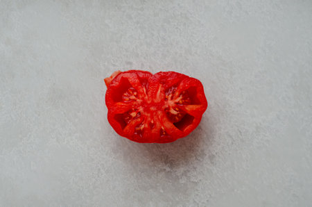 A half cut tomato isolated with a white background. Fresh healthy food, lifestyle concept, background.