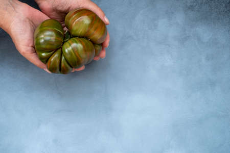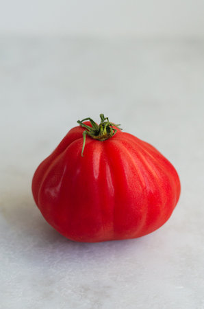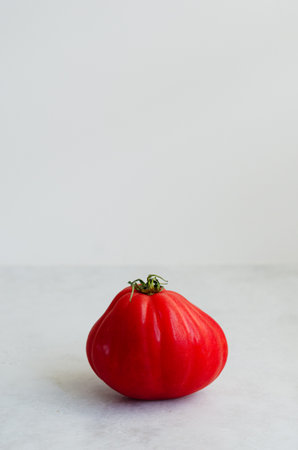 Fresh organic red oxheart tomato on a light stone background with space for text