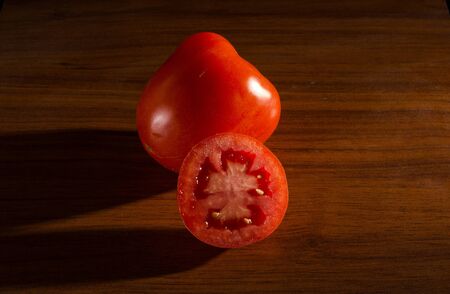 Half a tomato lies on a cutting board on a dark background. Ripe vegetables. Tomato set. Dark background. Healthy diet. Vegetarian food. Healthy diet. The design concept of the product.