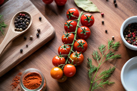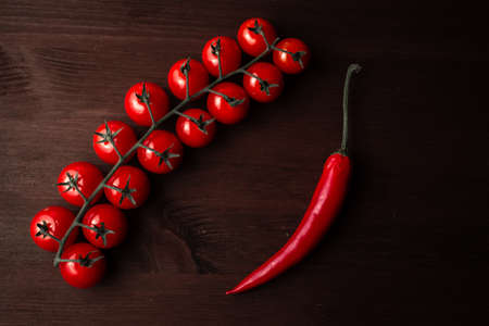 garlic red chili pepper and cherry tomatoes on a wooden table