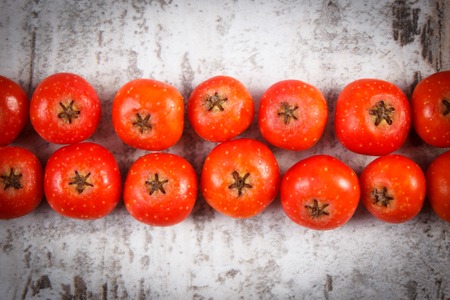 Red autumn rowan on old rustic wooden background