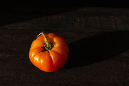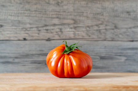 A fresh ripe tomato on wooden table with copy space