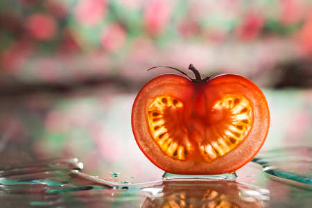 Translucent tomato slice with a background of red flowers blurred on glass and water to frame in a kitchen