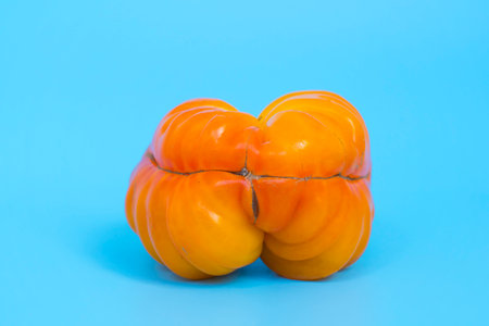 Ugly vegetables concept. Tomatoes of various unusual shapes on a blue minimal background. A metaphor for imperfection, the female body, the art of photography and form.