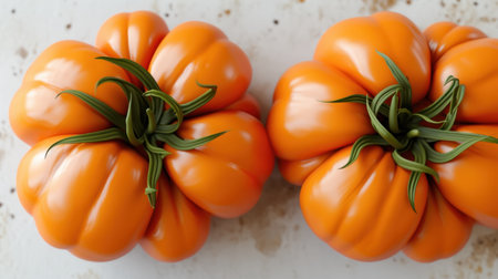 Juicy halved ribbed tomato top view on countertop