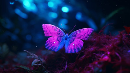 Detailed view of a otherworldly butterfly on a vibrant blue background, showing intricate glowing wings. Created with Generative AI