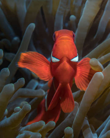 One red clown-fish looks at the camera, looking like an angry fish against the background of a sea anemone