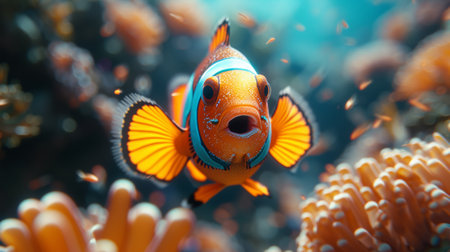 A vibrant clownfish swimming through anemones, vivid colors with a closeup shot