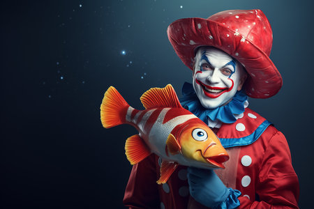 A funny clown in a huge stupid hat holds a big fish in his hand on a blue background. The concept of April Fools Day on April 1st, on the left there is a place for text