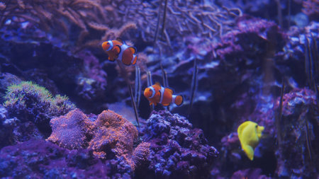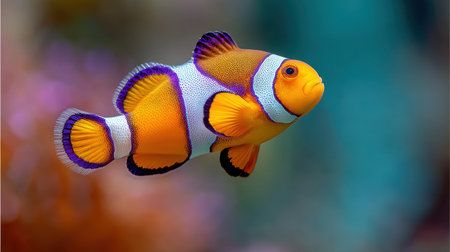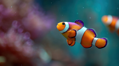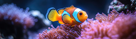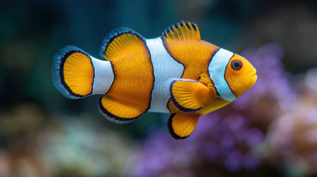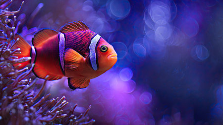 A colorful clownfish is depicted swimming near coral, set against a blurred background with shades of blue and purple. The image showcases high contrast and vivid colors, utilizing shallow depth of field. This underwater scene is likely suitable for editorial or commercial applications, conveying marine life.