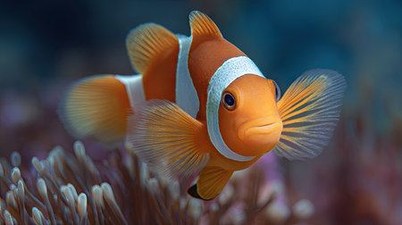 Close-up of a clownfish swimming among the coral in a colorful underwater scene