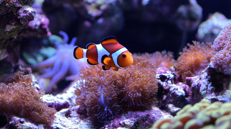 A lively clownfish swims playfully among brilliant coral formations in an underwater aquatic habitat. The scene showcases the colorful marine life and rich biodiversity.