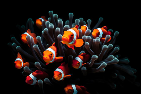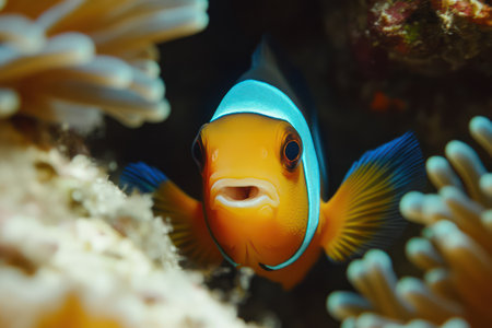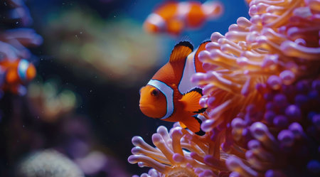 Clownfish among coral reefs, vibrant colors, underwater scene, marine life, closeup shot