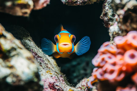 Vividly colored fish blending seamlessly into its rocky habitat underwater scene