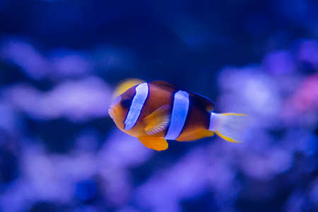 clown fish or anemone fish on dark blue background with transparent water in aquarium