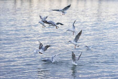 Seagulls are on and over the sea waters