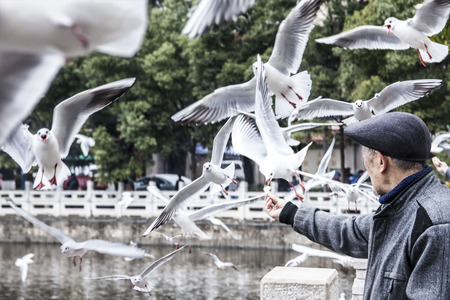Man feeds birds with bread from his hands