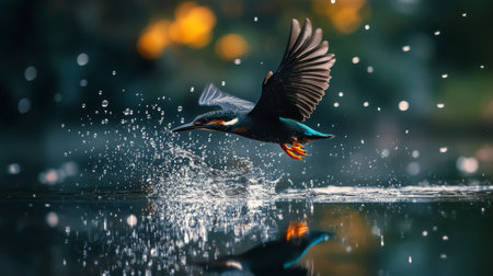 a bird gracefully soars through the air, near a shimmering body of water, basking in the warm sunlight. this forestpunk-inspired photograph captures the beauty of nature with its photorealistic representation. the vibrant colors of light red and dark brown create a captivating visual contrast. tilt-shift lenses add a unique perspective, while the lively illustrations and dappled lighting enhance the overall charm. a subtle rim light