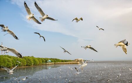 People feeding group of seagull fly over at Bang Pu seaside recreation center, Thailand.