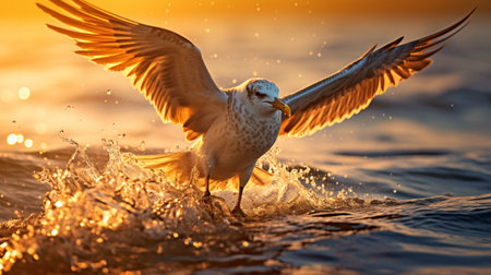 Numerous birds are depicted in flight over the ocean during sunset, bathed in warm hues. The composition features a textured water surface reflecting the sunlight. This image could be suitable for various commercial uses, including advertisements, websites, or editorial content.