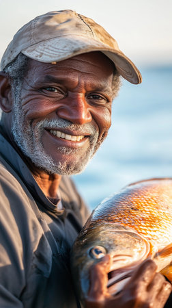 A fisherman proudly displays his catch while smiling in the fresh coastal air during a sunny morning at the harbor