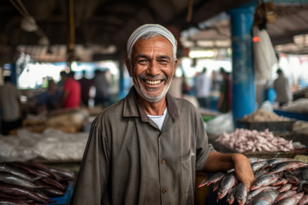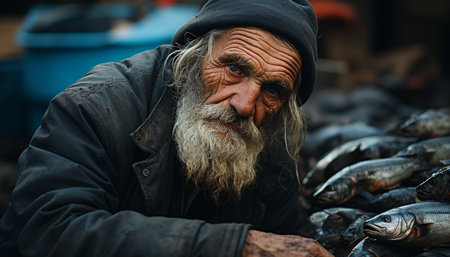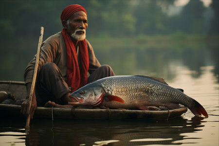 A weathered fisherman proudly showcases his impressive catch, exuding authentic emotions of triumph and fulfillment in his traditional fishing practice.
