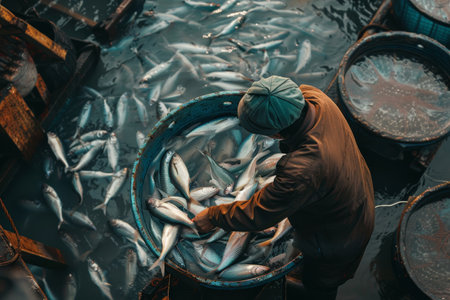 Seasoned fisherman at sea, capturing the essence of marine life and early morning fishing.