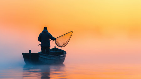 A tranquil scene of a solitary fisherman casting a net from a small boat during a misty sunrise, showcasing beautiful golden and orange colors, evoking peace and reflection.