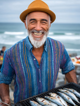 Happy retired man grilling fresh fish at a beach barbecue, enjoying the coastal lifestyle