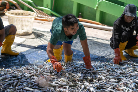 Fishermen sorting fresh fish catch, showing hard work and teamwork on a boat