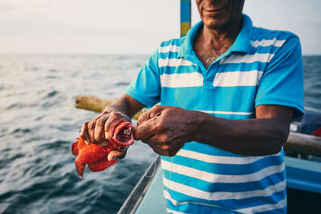 Senior fisherman holding red fish on fishing boat near coastline of Sri Lanka.