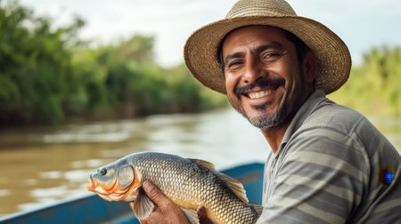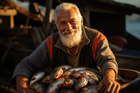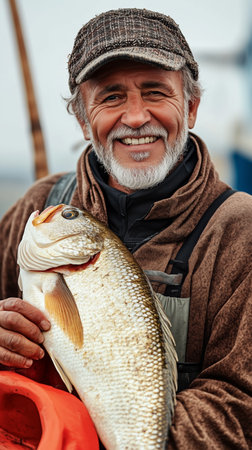A weathered fisherman proudly showcases his impressive catch, exuding authentic emotions of triumph and fulfillment in his traditional fishing practice.