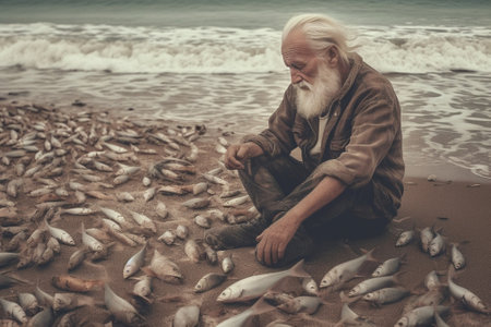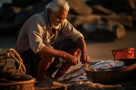 Ancient Fisher: Old Fisherman Sorting Fish. Generative AI