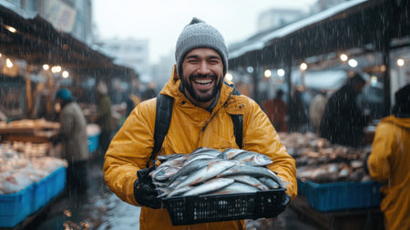 Smiling bearded man in yellow raincoat holding crate of fresh fish under heavy rain at outdoor fish market.