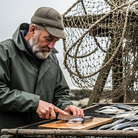 A weathered fisherman with a beard and cap meticulously prepares a pile of small fish on a cutting board.