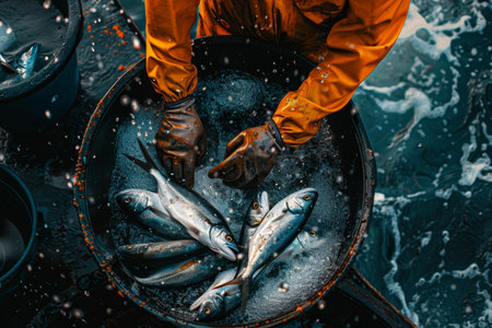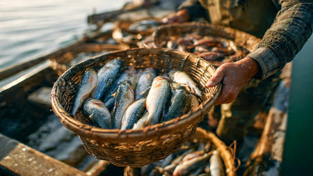 Fishermans Harvest Freshly Caught Fish in Rustic Basket Over Ocean Waters.