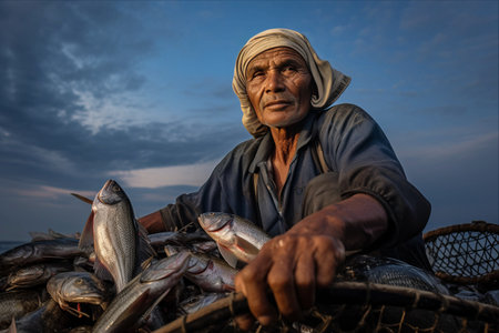 Seasoned fisherman at sea, capturing the essence of marine life and early morning fishing.