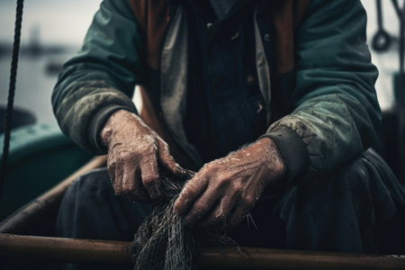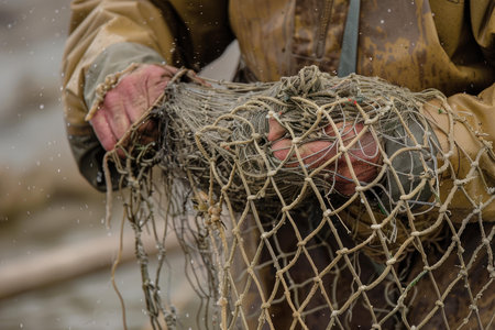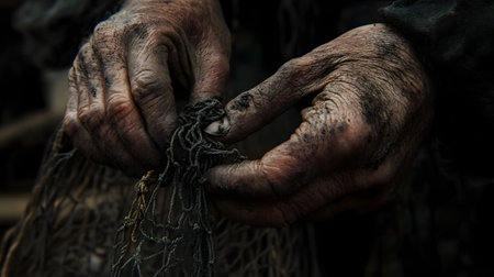 Close-up view of a seasoned fisherman's calloused, weathered hands meticulously repairing a well-used fishing net, showcasing the intricate process of knotting and the rugged textures of the materials.